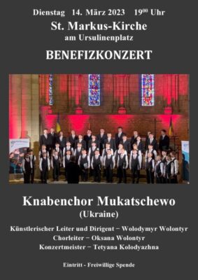 Liebe Freunde der Ukraine, wir laden Sie ganz herzlich zum Benefizkonzert in unserer St.Markus-Kirche ein. Programm: klassische und ukrainische Musik mit dem Knabenchor aus der Ukraine!